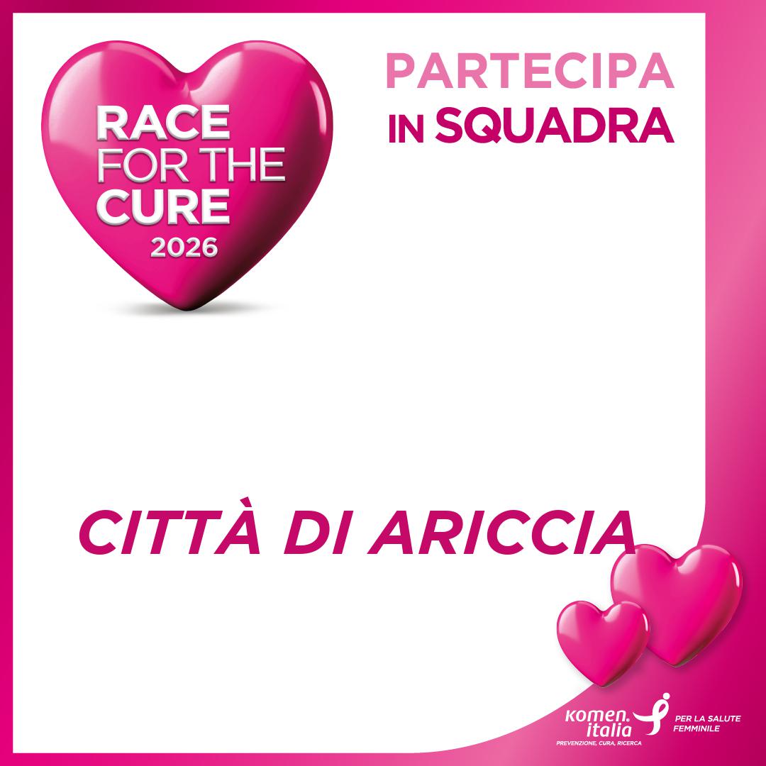 Anche quest’anno la Città di Ariccia aderisce alla “Race For The Cure” che si terrà a Roma il 10 maggio 2026. Per l’occasione è stata creata la squadra “CITTÀ DI ARICCIA” alla quale tutta la cittadinanza, il personale dipendente e amici sono invitati ad iscriversi, partecipando così attivamente a un’importante iniziativa di solidarietà e sensibilizzazione. È possibile aderire alla squadra collegandosi al link: raceforthecure.it/race/team/52/join/12608/HACEHZ.